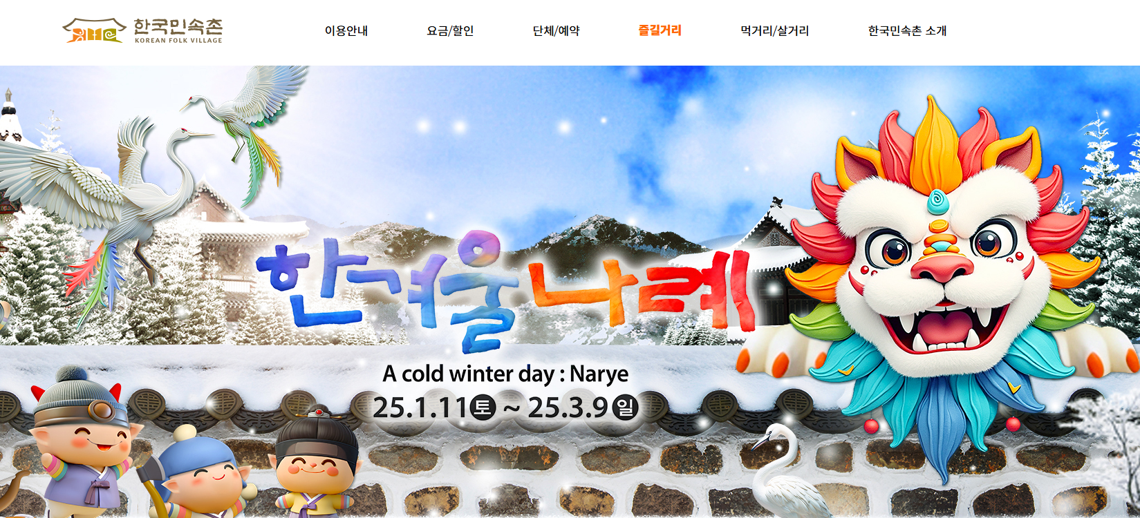 - 특징: 조선 시대의 생활상을 재현한 전통 문화 테마파크로, 다양한 전통 놀이와 공연을 즐길 수 있습니다.